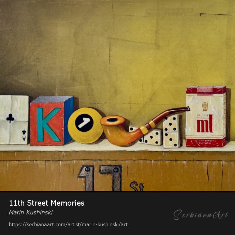 This oil painting on canvas, titled “11th Street Memories,” presents a nostalgic still life with a collection of vintage items arranged along a shelf. The composition includes playing cards with aces, a colorful block with the letter “K,” a yellow billiard ball, a smoking pipe, domino tiles, and a red-and-white pack of cigarettes marked “Filter MT.” Below the shelf, the number “11 St” is boldly displayed with an arrow, hinting at a specific place or memory. The earthy tones of the background create a sense of warmth and familiarity, while the meticulous arrangement of objects evokes themes of past leisure activities, personal stories, and vintage charm.