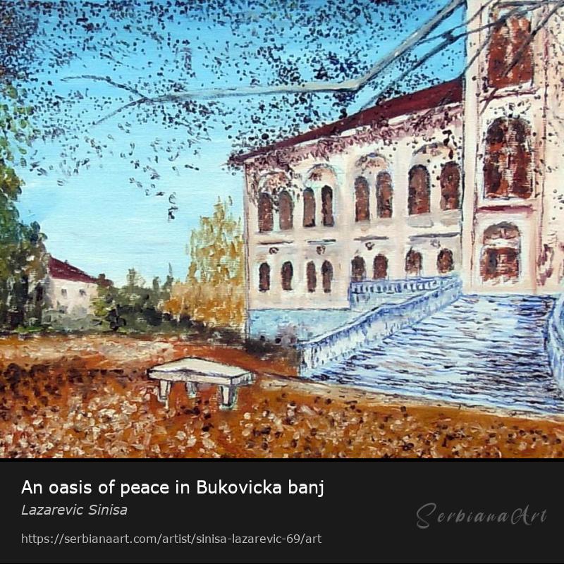 I present to you my latest painting, oil on canvas (50x40 cm), inspired by the beautiful ambience of the Bukovička spa in Arandjelovac. In the foreground, a peaceful park illuminated by light leads the view to part of the famous Staro Zdanje hotel, a symbol of elegance and past times. This painting carries the spirit of history and nature, a combination of nostalgia and timeless beauty.
