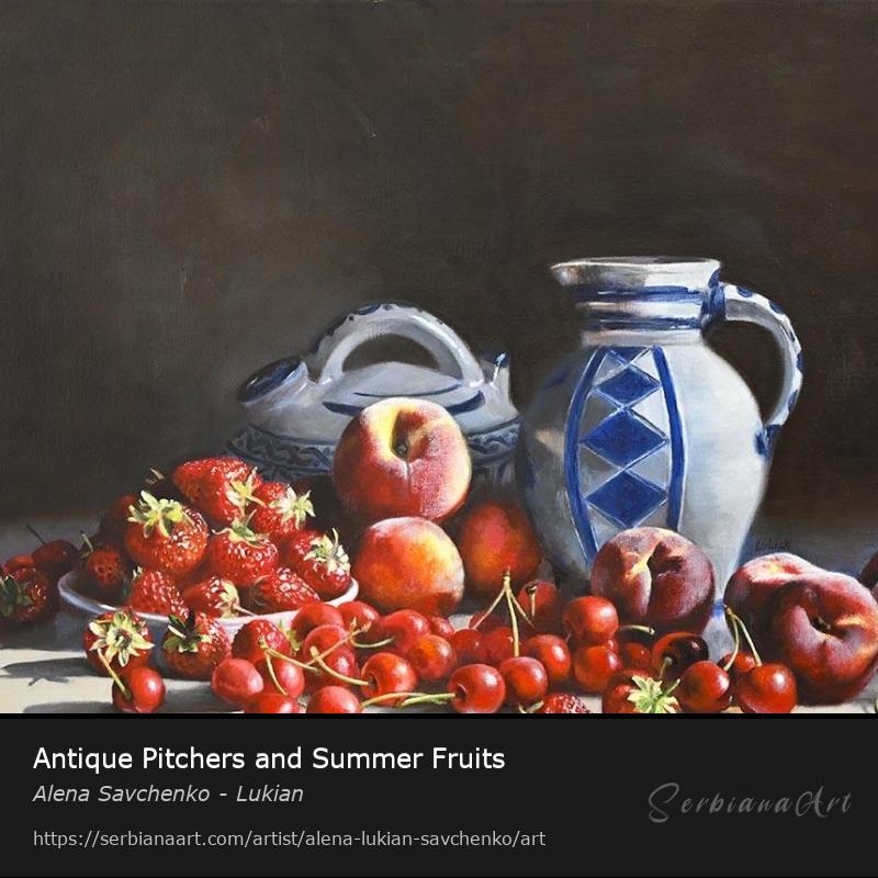 This original still life oil painting captures the timeless beauty of antique ceramic pitchers paired with ripe summer fruits – strawberries, cherries, and peaches. The harmonious composition, warm lighting, and realistic details create a sense of elegance and nostalgia.