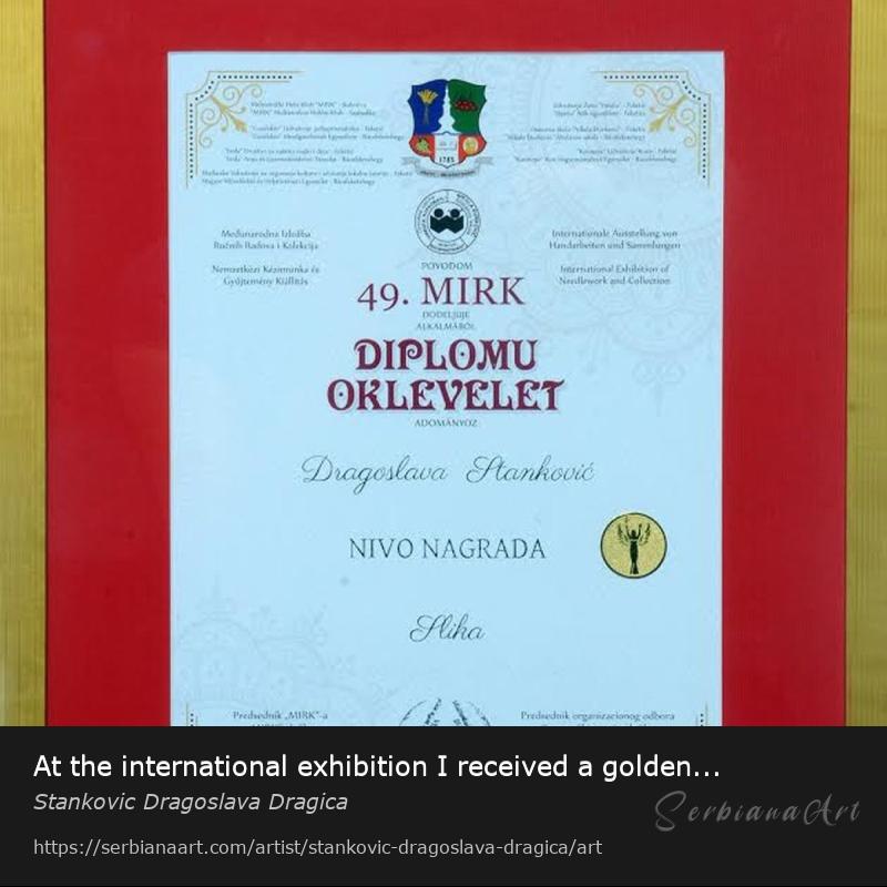 I participated in my work at the international exhibition with the association ``LIKUM`` in Vojvodina, the town of Feketić, where my painting was awarded with the golden diploma of Serbia.