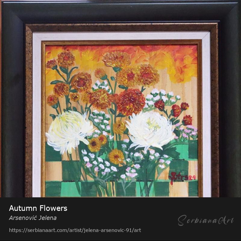 tAutumn Flowers *30 x 30 cm with frame *20x20 cm canvas Ryacrylic on cotton canvas *90 € # jars21 Chrysanthemum, as a plant that comes from China and is the most widespread in Asia, where it is considered a flower that has the power to attract happy circumstances, or at least so believe the ancient cultures of the Far East. The idea of a close connection between chrysanthemums and the Sun also originates from Asia, because the flower is considered to be the carrier of Yang energy. It is a popular thought in many Asian countries that the chrysanthemum is primarily a flower of happiness, and in its part, the Festival of Happiness is held in Japan every autumn.