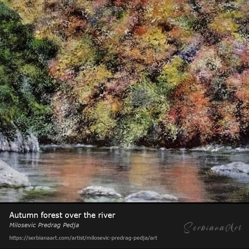 The picture shows an autumn landscape with a view of a calm river above which rises a hill covered with dense forest in warm autumn colors. The golden, orange, and red shades of the leaves create a rich contrast with the bluish tones of the water. Smaller rocks emerge on the surface of the river, adding natural dynamism and depth to the scene. The hill towering over the river conveys a sense of the strength and constancy of nature. The whole scene exudes the silence, warmth, and serenity of an autumn day.