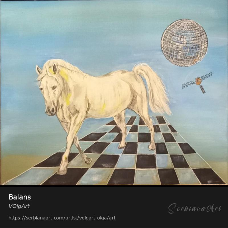 This composition explores the duality of human existence - the balance between instinct and reason, freedom and discipline, nature and technology. The white horse in motion symbolizes progress and adaptability, while the disco ball and satellite together create a cosmic dimension, recalling the constant interaction between enjoying the moment and the influence of the outside.