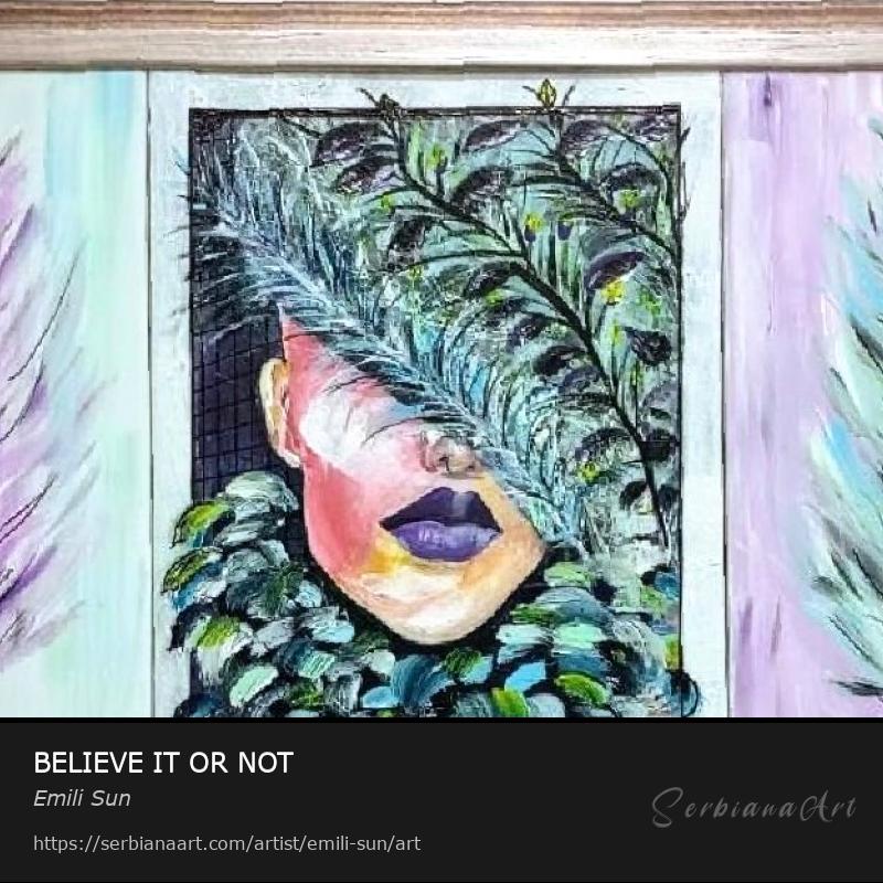 The artistic painting "Believe it or not" depicts the symbolism of the power of faith that cannot be seen with the eyes. Its harmony of colors and expressiveness of motifs fit with all colors of the interior, especially with purple and emerald tones as well as diverse plant life.