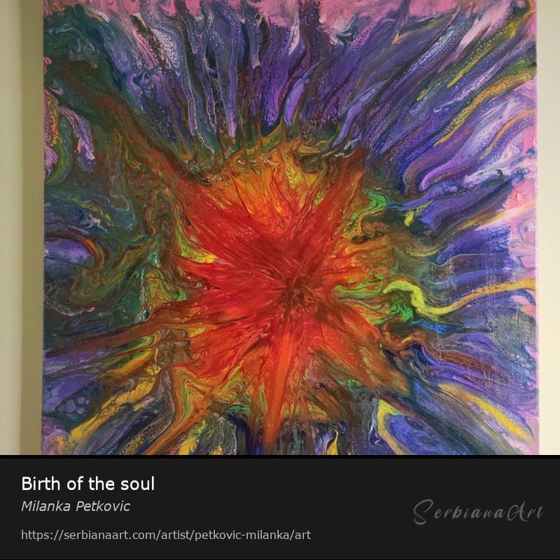 Symbolic representation of the birth of the soul from the center, which spreads through the Universe, taking on the colors of the environment. Combined technique of fluid spilling of acrylic paints with Floetrol and oil drops that made divine cells and the interweaving of the entire spectrum of colors. The painting was at an independent exhibition in 2020 in the house of Đura Jakšić in Belgrade