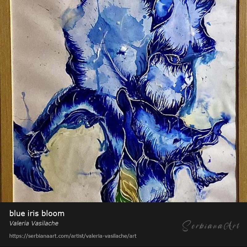 This piece, "blue iris bloom" is a striking botanical study utilizing a wet-on-wet technique, most likely a wax resist combined with watercolor or ink. The technique itself perfectly embodies the "Wax and Wilt" theme: the wax holds the white paper in pristine relief, protecting the form of the iris as the dark, saturating blues and inks bleed and spread across the surface, creating a beautiful, controlled chaos.