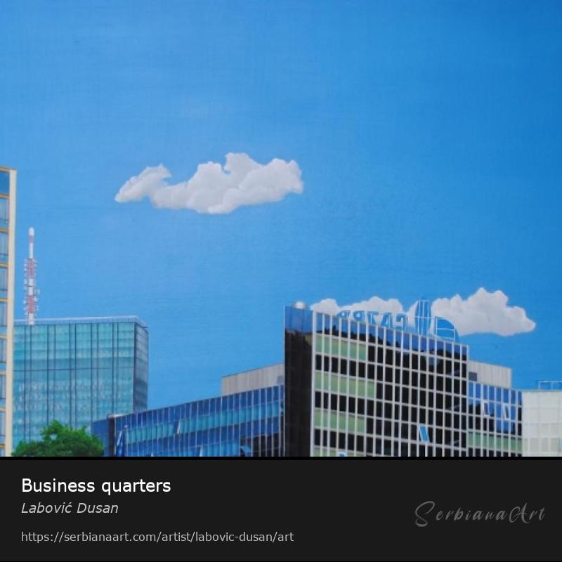 Slika panorame savremene beogradske poslovne četvrti gde je prikazano više krila tri poslovno- komercijalna objekta. Uz kupljenu sliku isporucuje se gratis specijalna drvena kutija, namenjena za slučaj odlaganja slike, u kojoj je slika zaštićena od atmosferskih uticaja.