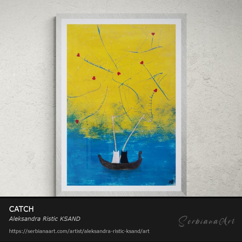 "Catch" portrays a heartfelt moment between a wise older white cat, Mija, and a curious younger black cat, Gari, as they fish together from an old wooden boat. The boat, weathered yet strong, symbolizes timeless wisdom, while Mija patiently shares her knowledge, guiding Gari in the art of fishing. Hearts? Sharing is caring, that’s why it’s love.