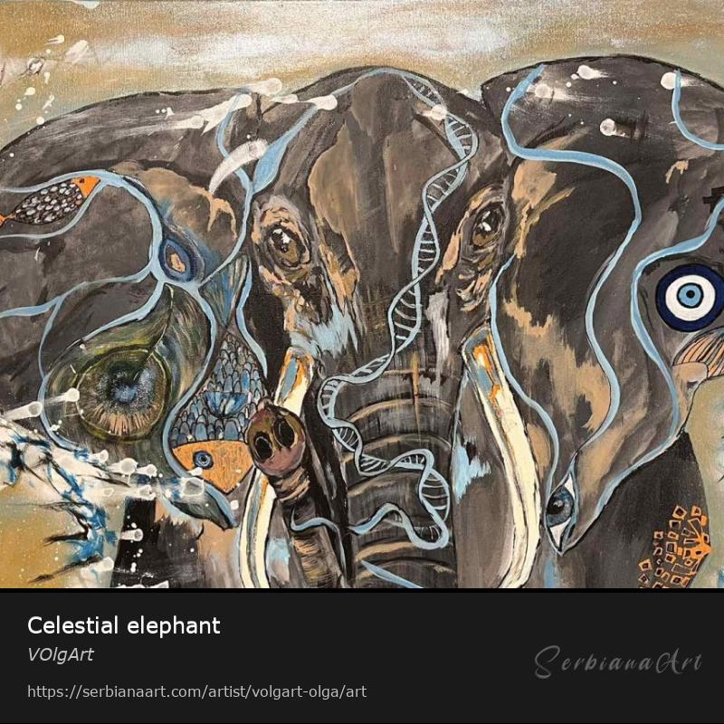 "The Celestial Elephant" is an artwork that blends symbols and elements from various cultural contexts. The intertwined elephant, veined with life force, symbolizes vitality, while the fish represents the Christian symbols of faith. The addition of the Fatima's eye enriches the spiritual dimension of the painting. The elephant positioned amidst clouds evokes a sense of otherworldly presence, indicating a transcendent dimension of life and faith.