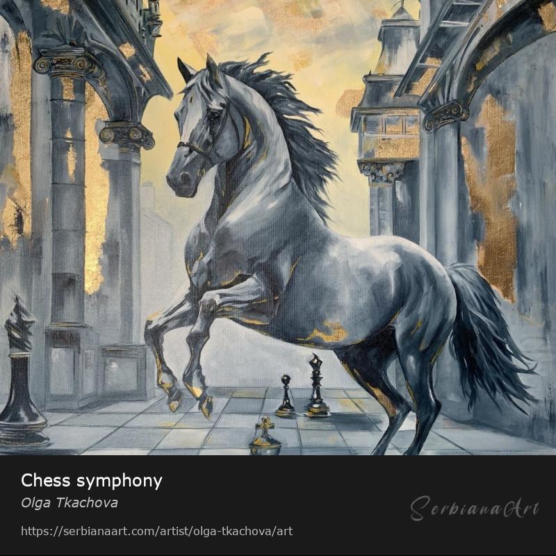 Chess symphony is a fascinating oil painting that combines chess symbolism with mystical elegance. On the dark field of strategic combat, a real horse rises, the materialized essence of movement, power and unpredictability. It is not just a piece - it is a living chess knight, breaking the rules, walking freely between the fortresses of power and the borders of fate.