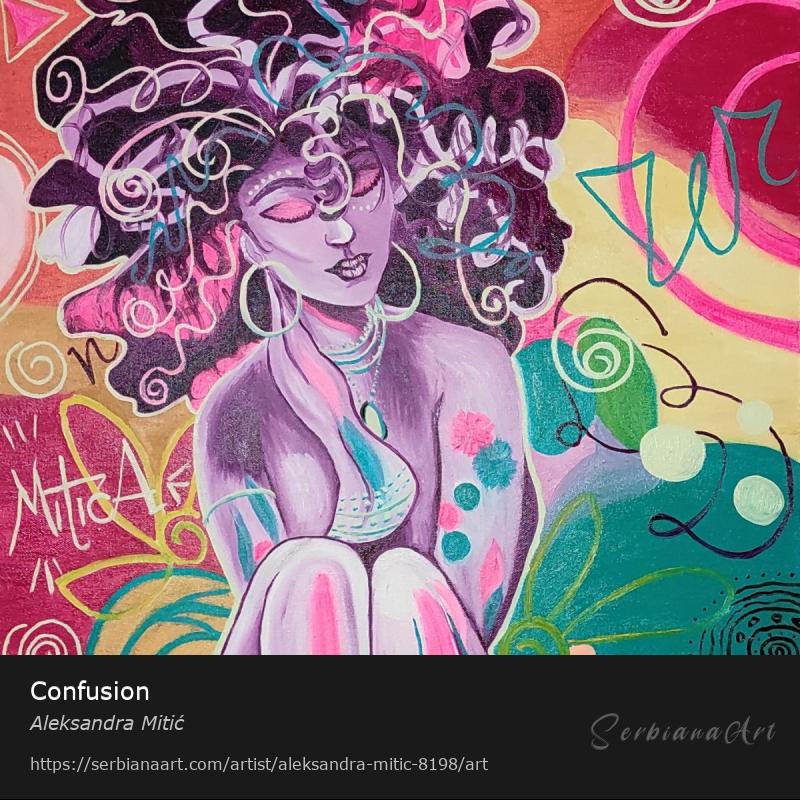 The painting "Confusion" presents a vivid blend of a human figure and decorative elements. The contrast between the calm expression of the figure and the dynamic spiral lines and ornamental motifs creates a sense of inner dialogue between tranquility and a burst of creativity.