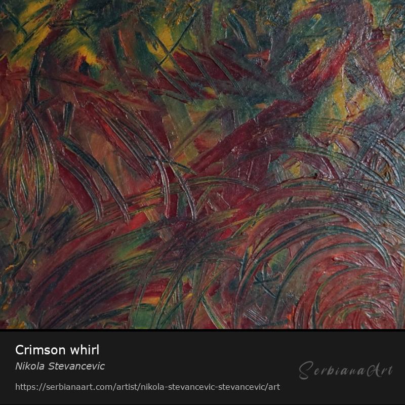 A raw, textured storm of deep reds, earthy greens, and golden bursts, Crimson Whirl captures the energy of movement and chaos within nature. Bold strokes carve swirling paths through layered pigment, evoking both windblown leaves and the spiraling pull of a hidden vortex. This abstract piece invites the viewer to feel rather than define, immersing them in its rhythm.
