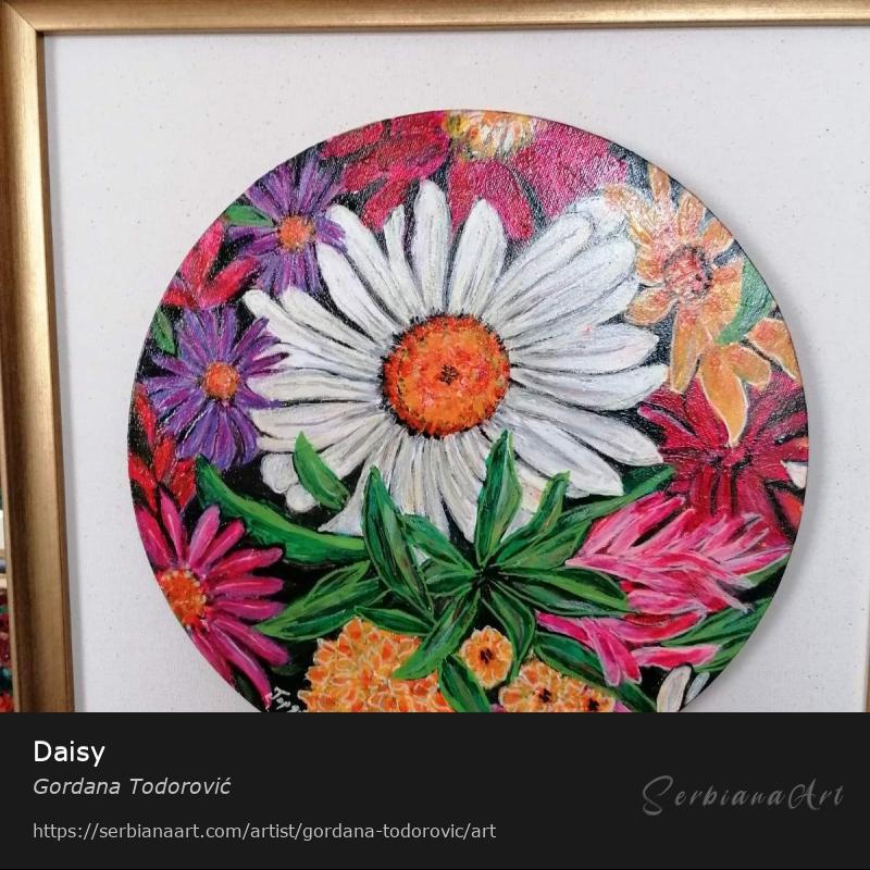The picture is original with the inspiration of flowers in my garden.It was made with acrylic, using a circular shape on a canvas that is framed on cardboard and a beautiful frame.lt will refresh your ispace with good energy.zthe width of the frame is added to dm.Contact on email:gordana.todorovic47@gmail.com or telefon number:+381 3 344652.