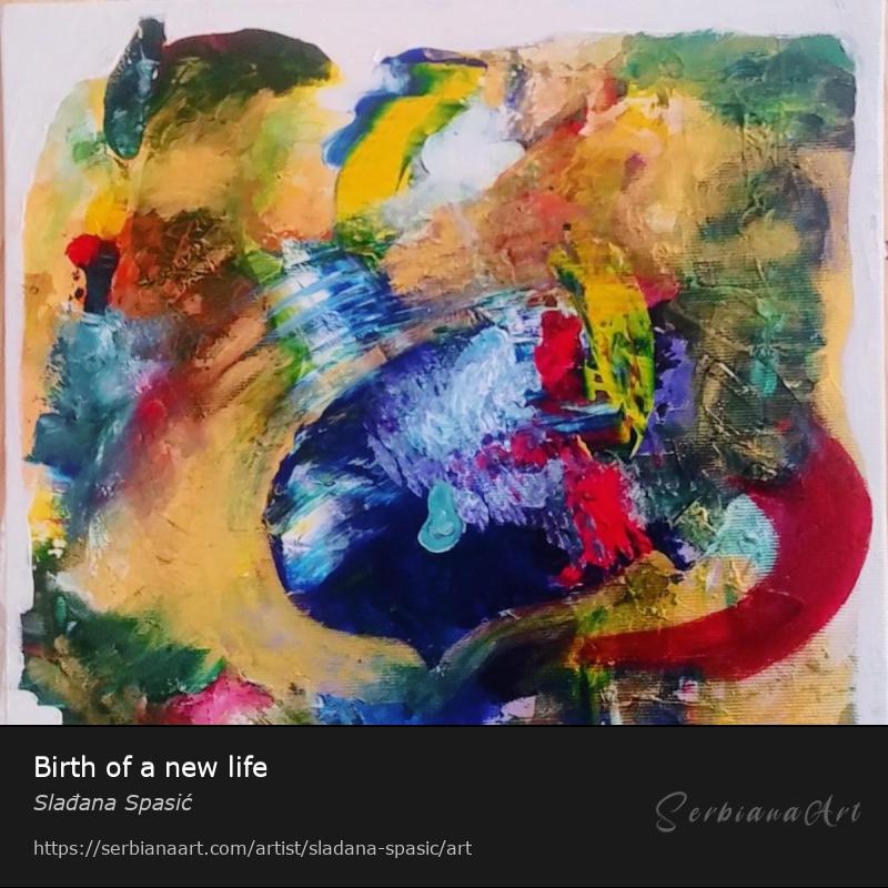 "DNK" is a picture of beautiful colors, in the middle of the picture there is a big blue egg with an extended umbilical cord, a new life is born.
