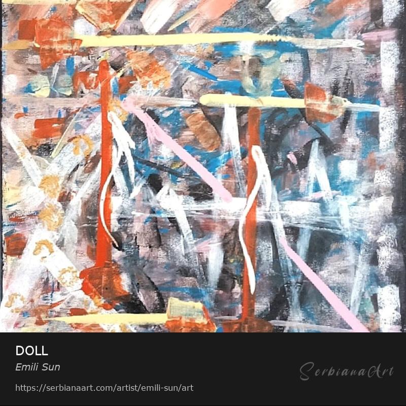 The painting Doll, acrylic on canvas, abstraction, 60x50cm, without frame, 2021, is part of the permanent exhibit of the VR exhibition "Whispering Constellations" on the website Artsteps, ilustrates a poem from the book of the same name, part of which is below: "On the side of the good, on the side of the brave, felt a close meeting of power. My hand itself trembled violently! I didn't know if a tear would come. Regardless of your own, then and now, an old dream awakens in the soul. The way I kiss you I stopped the day with the same smile. On the side of the good, on the side of the brave, we meet with desire, where love dreams. Her unfading memories shelter her, engraved in the heart, it is forever alive. The doll inside me is still standing..." from the poem "Doll" in the book The Whispers of the Constellations by Emili Sun