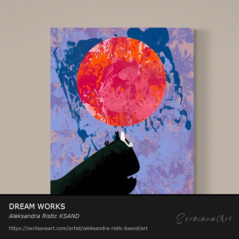 The contrast of the calm feline figures and the vibrant planet evokes a sense of wonder, imagination, and the courage to strive for the extraordinary. Perfect for cat lovers, dreamers, and art enthusiasts, "Dream Works" adds an inspiring and magical touch to any space, encouraging you to embrace the limitless potential within and around you.