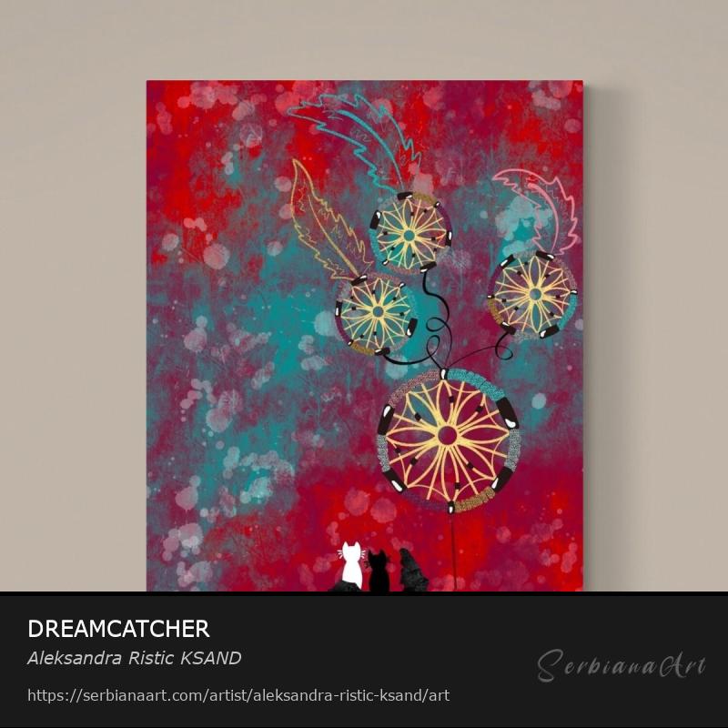 "Dreamcatcher" painting with a white and black cat, with a large "Dreamcatcher" designed to capture all their wishes and manifest them. It's a guardian of destiny, symbolizing the belief that it holds the threads of their future. The "Dreamcatcher", with its intricate web, represents the way dreams, hopes, and desires are woven into the fabric of one's life, protecting and guiding the individual toward their true path. It serves as a reminder that the future is shaped by what we choose to manifest and that our dreams are powerful forces shaping our destiny.