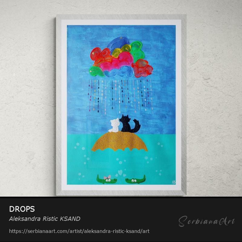 Dive into the vibrant world of "Drops," an acrylic painting featuring two cats—one white, one black—wisely observing an extraordinarily colorful cloud. Stunningly colored drops fall from the sky, each representing the unique meaning of every rainstorm in life—reminding us that every challenge or emotion carries its own color and purpose.