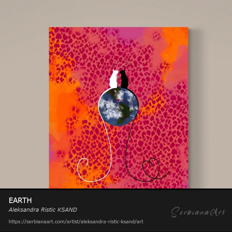 "Earth" is a vibrant celebration of connection and love, featuring a white and black cat sitting together atop the world, with a small heart on the planet’s surface symbolizing love for our home. Surrounded by a space of vivid colors, this painting captures the magic of the cosmos and the wonders of life on Earth.