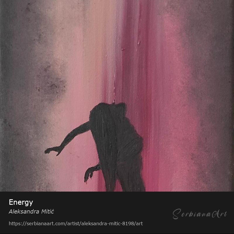 The painting "Energy" portrays the silhouette of a woman in motion, illuminated by vertical beams of warm light. The dark figure against a background of pink and gray tones symbolizes strength, freedom, and the inner power released through movement. The minimalist style and strong contrast bring emotional depth, while the vertical color flow adds a sense of vitality and passion.