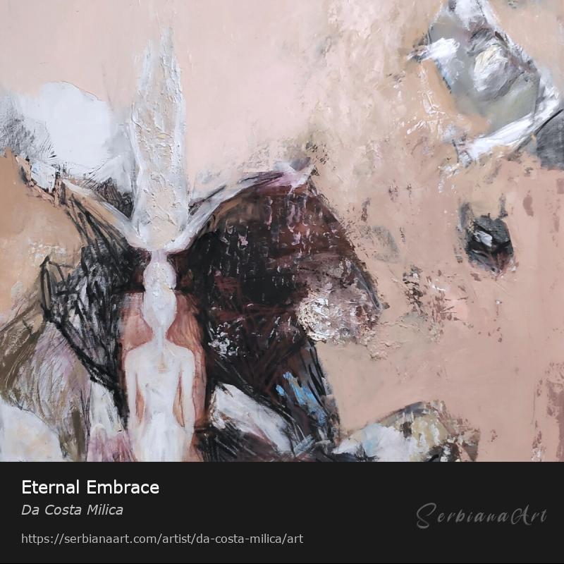 The composition is abstract, with fluid and organic shapes that seem to dance across the canvas. These shapes intertwine and separate, representing the intricate and evolving nature of soulmate connections.The artwork employs a subdued palette of neutral tones, including soft grays, gentle beige, and muted taupe. These colors create a sense of tranquility and timelessness.The strong contrast between the dark and light elements in this abstract painting draws immediate attention. Bold strokes of deep charcoal and beige intertwine, symbolizing the union of two souls, each with its unique qualities.