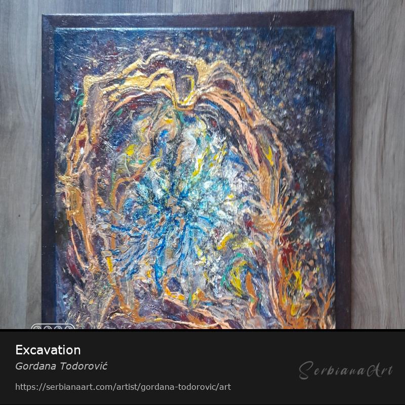 Original work in mix tehnique with shiny and golden coatings.Exibited work in USA St.Luis in 2018 year.The canvas is on a frame with an usual appearance.Contact at iml:gordana .todorovic47@gmail.com or phone number +38163344752.