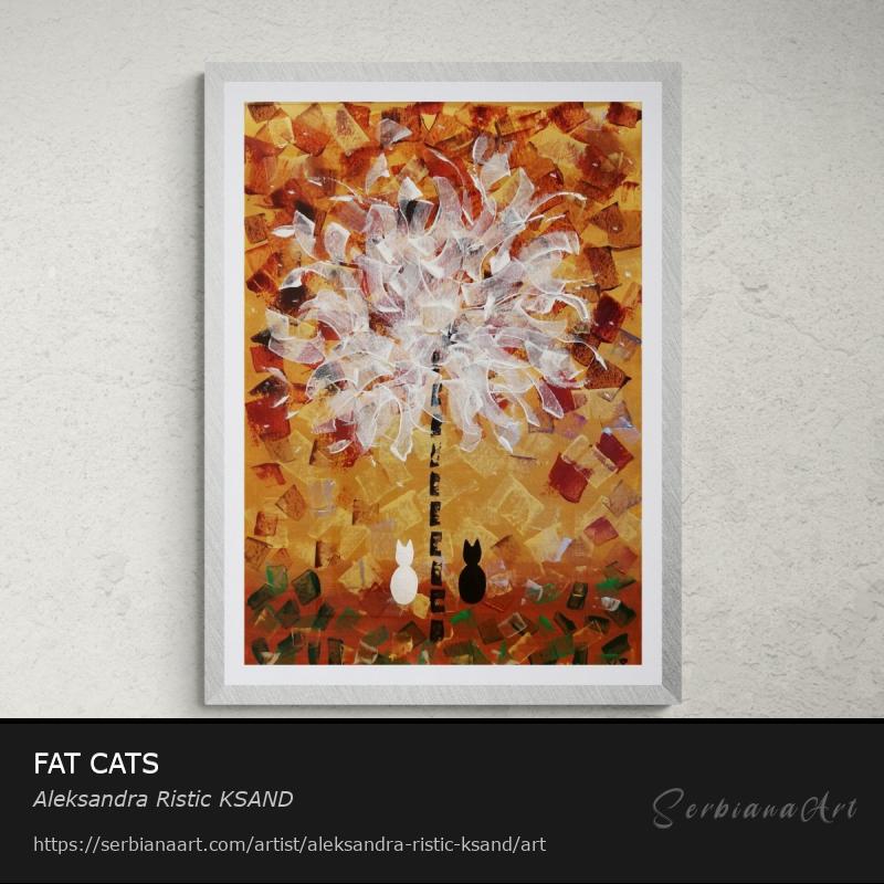 "Fat Cats" depicts a white and a black cat peacefully gazing at their lavish tree, a symbol of prosperity and abundance. This lush black/white tree represents a fresh start and hard work, while the surrounding colors—reminiscent of gold, silver, bronze, and wealth—symbolize success, stability, and the rewards that come with dedication.