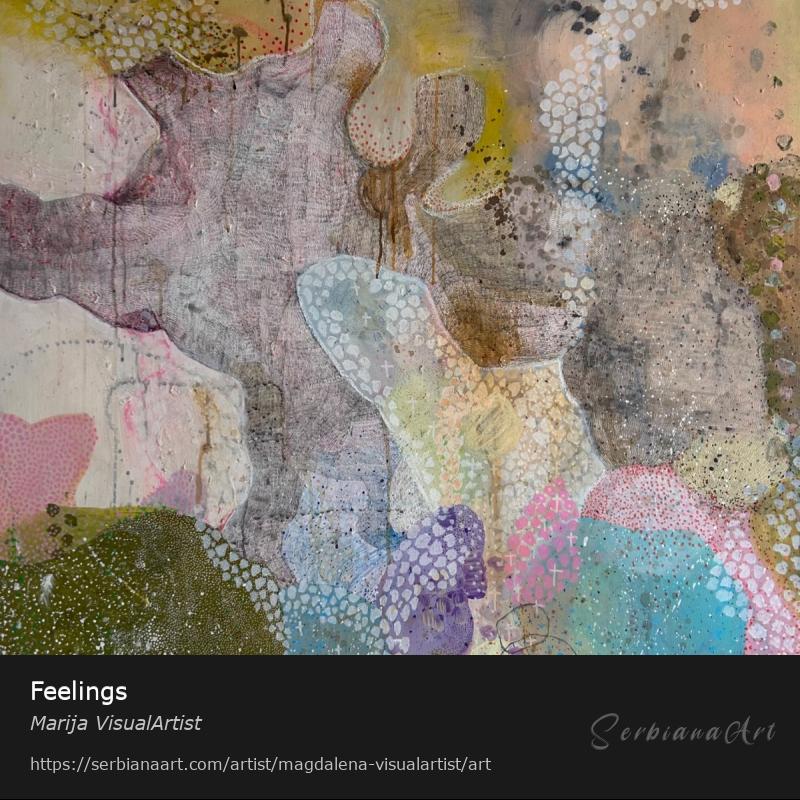 Acrylic on canvas in combination with a combined technique (colored pencils, oil pastels, dry pastels, acrylic markers, graphite pencil...)