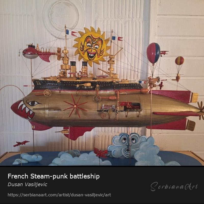The boat is made of combined materials (wood, metal) painted with acrylic paints. Complete handmade starting from the blueprint to the model.