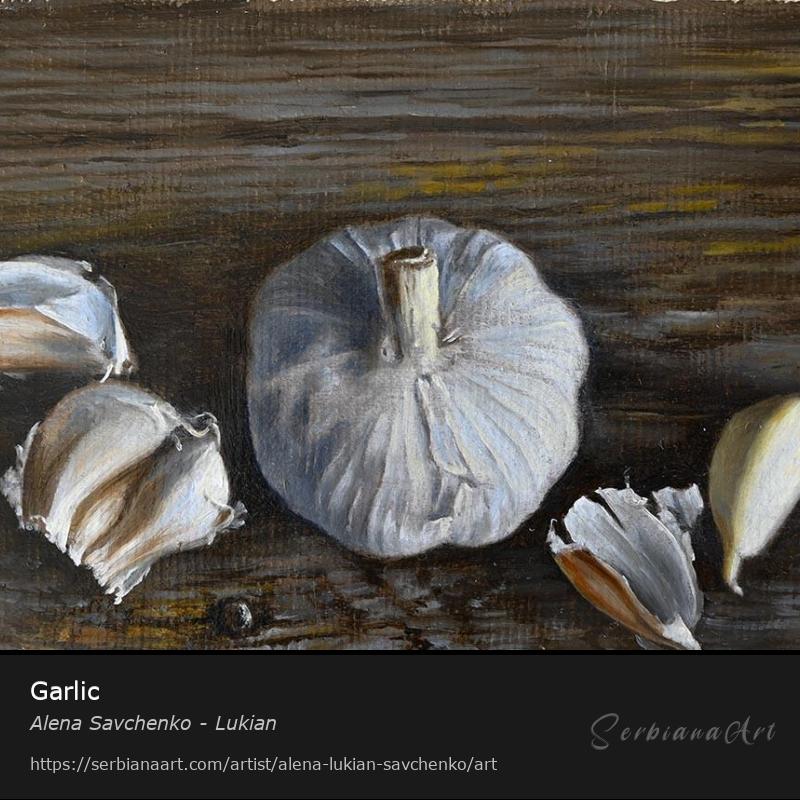 This artwork depicts a garlic bulb with layers of dry, textured skin, painted in oil on linen canvas. In the hyperrealistic style, every detail is meticulously rendered – from the translucency of the skin to the tiny imperfections on the surface of the cloves. Warm tones and shadows create a sense of depth and natural elegance. The painting highlights the beauty of simplicity in everyday objects, transforming garlic into a captivating piece of art through its precision and composition.