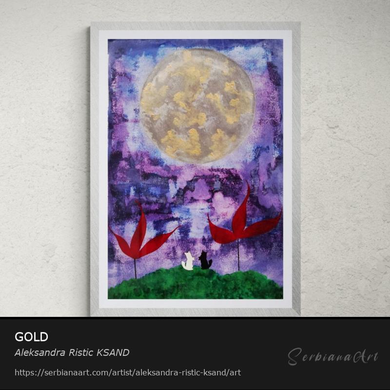 "Gold" depicts a white and a black cat standing on their hind legs, mesmerized by a radiant golden planet suspended in the vastness above. The glowing planet symbolizes dreams, ambitions, and the limitless possibilities that lie within reach for those who believe and strive.