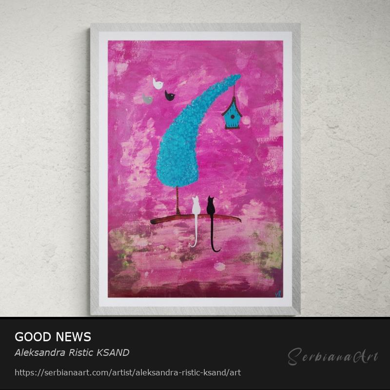 "Good News" depicts a white and black cat beneath a blue tree, symbolizing the Universe as a vast and mysterious force. The tree acts as a universal Telegram, receiving and sending all kinds of news—good, bad, and neutral (white, black, and grey birds).