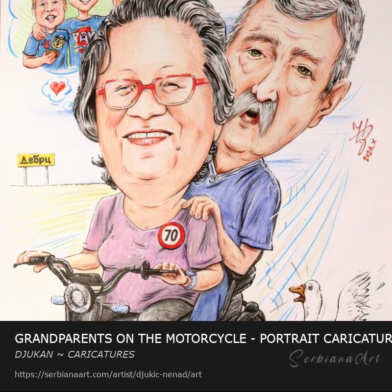 GRANDPARENTS ON THE MOTORCYCLE - PORTRAIT CARICATURE