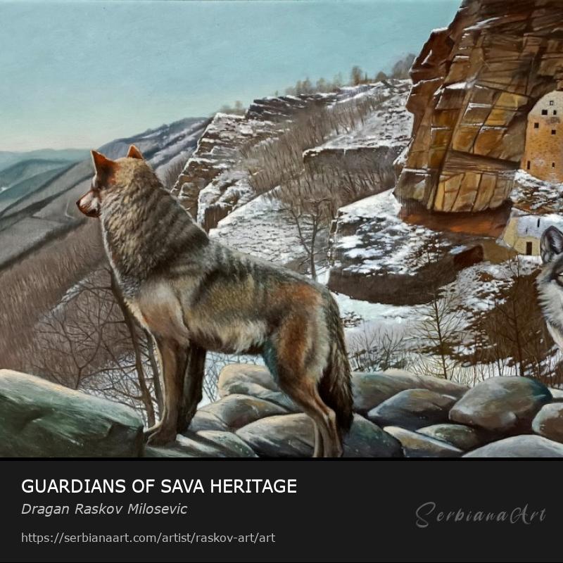 From this snowy environment rises a rocky mountain on which, like a swallow's nest, Sava's hermitage overlooks the gorge of the river Studenica. Under the watchful eye, two beautiful wolves in the foreground watch over everything...