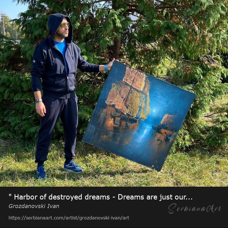 " Harbor of destroyed dreams - Dreams are just our reality on Hold ".....Painted with expressive moves.......with pallet knife and with a brush.....W 100 x H 100 cm ,( W 96 x H 96 cm ,when the canvas is stretched on the wooden frame )....