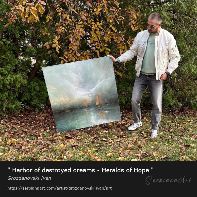 Harbor of destroyed dreams - Heralds of Hope.....Painted with expressive moves.......with pallet knife and with a brush.....W 100 x H 100 cm ,( W 97 x H 97 cm ,when the canvas is stretched on the wooden frame )....