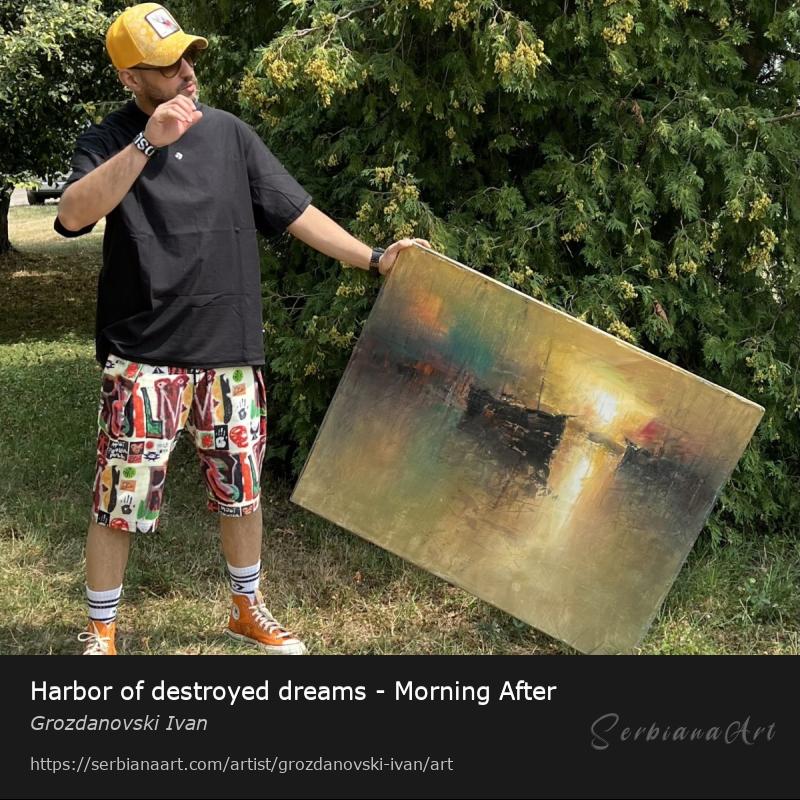 " Harbor of destroyed dreams - Morning After ".....Painted with expressive moves.......with pallet knife and with a brush.....W 99 x H 80 cm ,( W 96 x H 77 cm ,when the canvas is stretched on the wooden frame )....