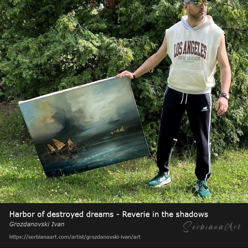 " Harbor of destroyed dreams - Reverie in the shadows " .....Painted with expressive moves.......with pallet knife and with a brush.....W 100 x H 80 cm ,( W 97 x H 77 cm ,when the canvas is stretched on the wooden frame )....