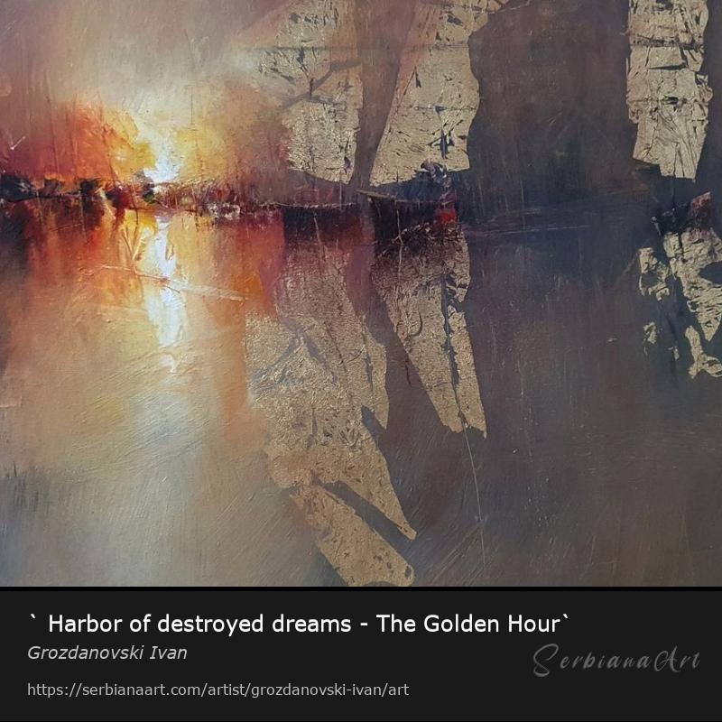 Original artwork description: " Harbor of destroyed dreams - The Golden Hour " This painting is from series of paintings "Harbor of destroyed dreams" which 2017 won the 1st place in the category of abstraction / American Art Awards/ .Painted with expressive moves.....!!! W 70 x H 50 cm Impressionistic ( Abstract) style.......I'm giving all best, to be represent the true colors of the paintings in the photos, but sometimes you can see a little difference in tone..... I take good care packing my art, so it comes to you in the great shape. Note !!! The painting on the wall of the room is not in true scale....!!!! All my artwork is original !!!! Materials used: Acrylic ( Liquitex) & Oil ( Van Gogh)..... on the end covered with a satin coat of varnish, to protect it for the UV and dustShare and promote this artwork