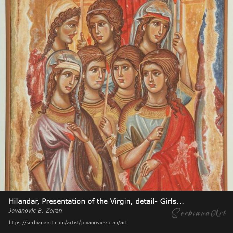 Month Athos, Serbian Monastery Hilandar (about 1320.), composition - Presentation of the Virgin, detail: Girls with candles, copy of the icone. This copy of the icone is in the author`s possession, and the deadline for making the same is negotiable (about 25-30 days).