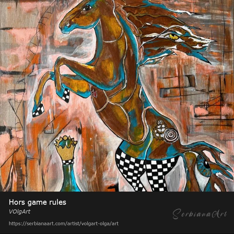The picture depicts a powerful scene where the elevated horse symbolizes strength and vitality, while the chessboard on its hind legs suggests a power play. The veins coursing through the horse add a deep layer of symbolism, representing the life force flowing through it. Hidden eyes emphasize introspection. Chess elements bring an intriguing aspect to the image. The horse's hind legs painted as chess pieces suggest a game of strategy and power. The queen and pawn next to the horse may symbolize the dynamics of power and hierarchy, presenting a dynamic experience that prompts reflection on the complexity of life and interactions among the characters in the picture.
