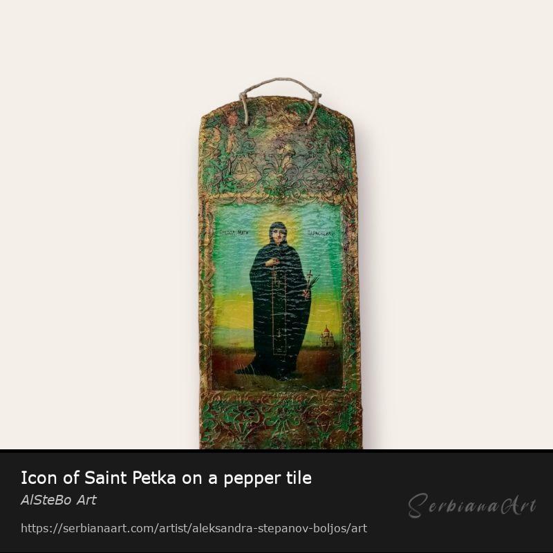 The icon of Saint Petka with a blessing, made with a combined technique (decoupage, stencil, . . . ) on pepper tile.