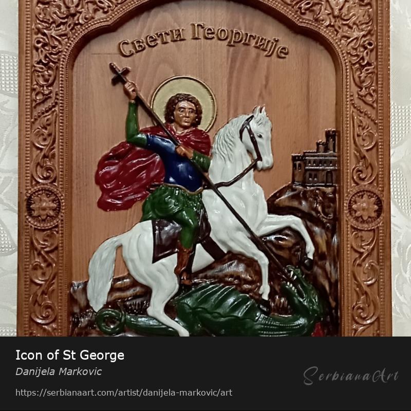 Hand-painted icon of St. George, made with acrylic paints on a relief in beech wood.