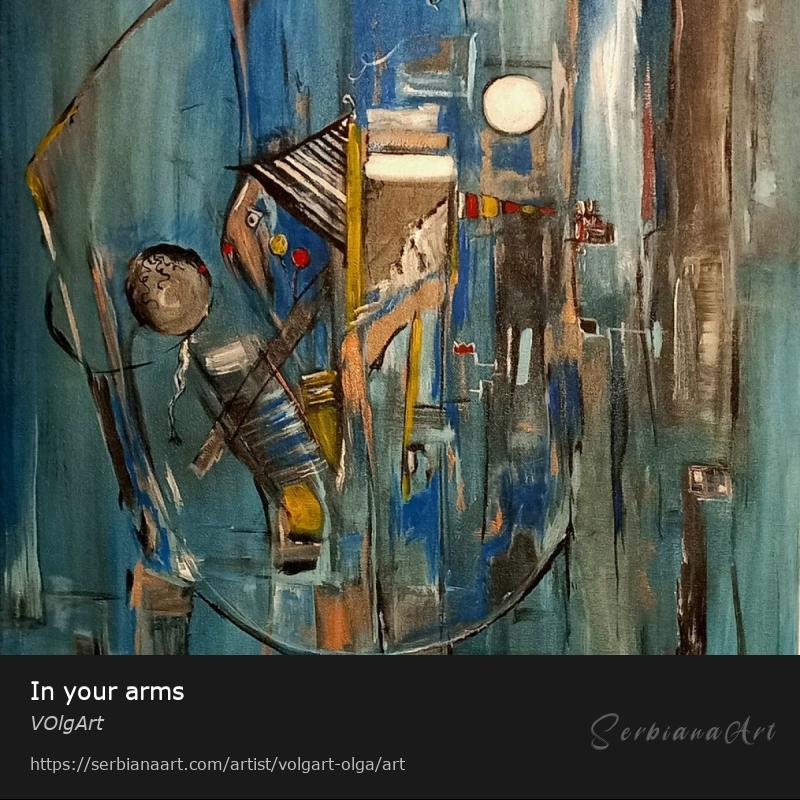 The artwork "In your arms" exudes abstraction, where blue color and shades of blue form an atmosphere of intimacy. This painting, recognizable by its abstract representation, suggests two lovers embracing on the open sea, while the moonlight in the background further emphasizes the romance of the moment. Through my blue palette, I convey a sense of love and connection, exploring emotional depths through visual abstraction.