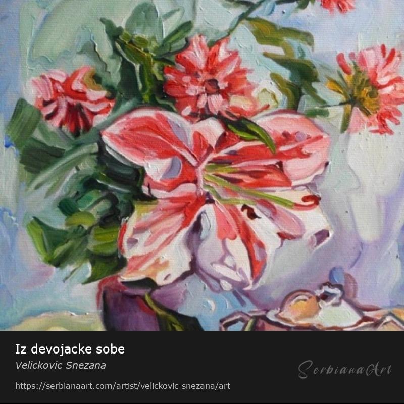 PRELEPO ulje na platnu (platno kasirano na drvenu plocu,ex. kvalitetna tehnika) naziv ,,Iz devojacke sobe'' dimenzije 48 x 35 cm rad akademskog umetnika,potpisanoShare and promote this artwork