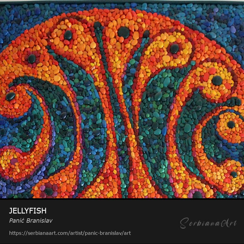 Stones are painted with acrylic colors, arranged and glued onto plywood.Share and promote this artwork