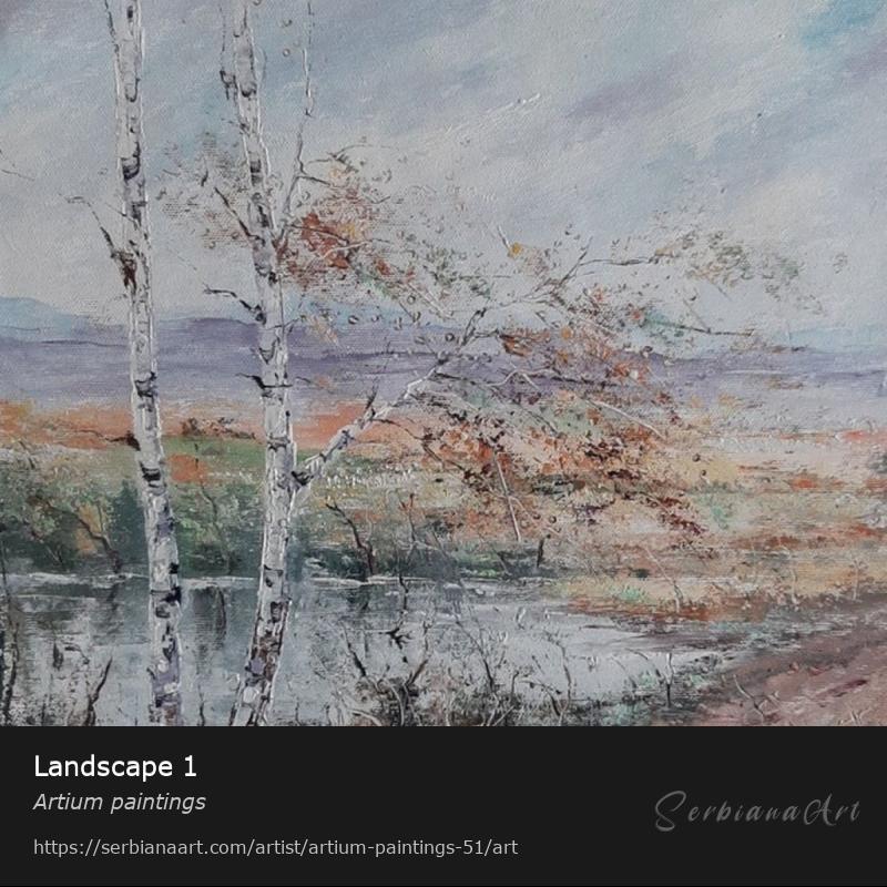 The painting ``Landscape 1`` is dominated by a palette of earth tones. The two birches on the left balance with the road on the right, while the depth is achieved by the painter by arranging the plans of the water surface and the mountains in the background.Share and promote this artwork
