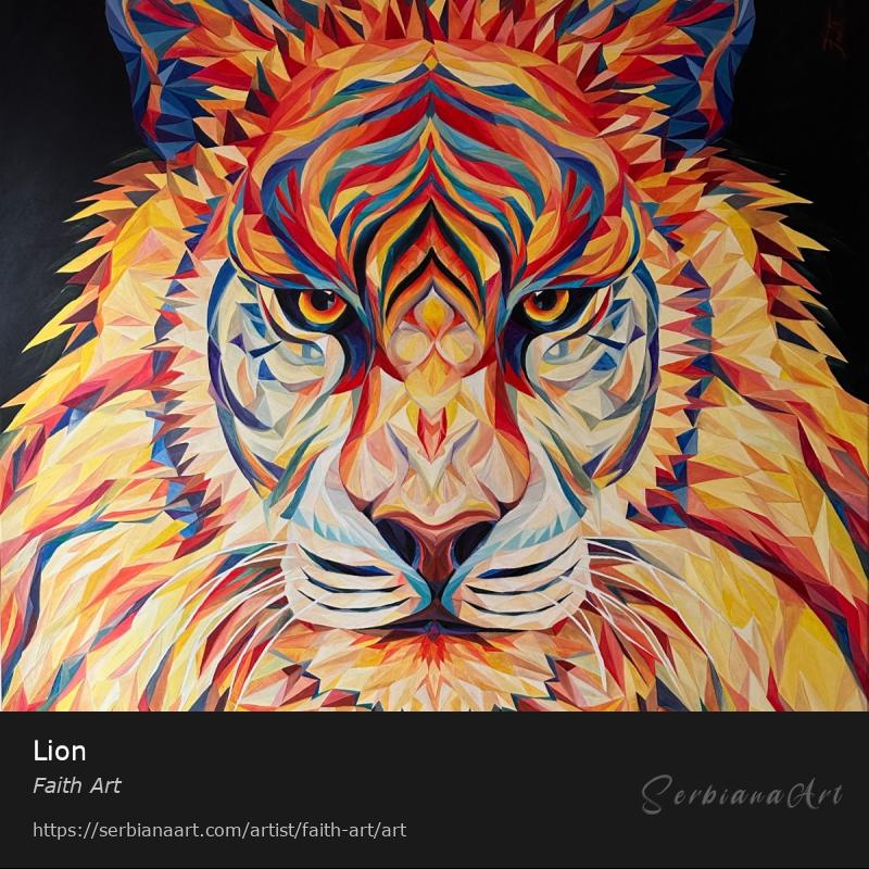 This painting depicts the portrait of a lion created in a low poly technique, composed of hundreds of sharp geometric shapes and vibrant colors. Through a bold mix of red, orange, blue, and golden tones, the lion radiates strength, dignity, and inner fire. Though abstract in form, the artwork carries a symbolic depth, portraying the lion as an eternal symbol of courage, confidence, and spiritual power.