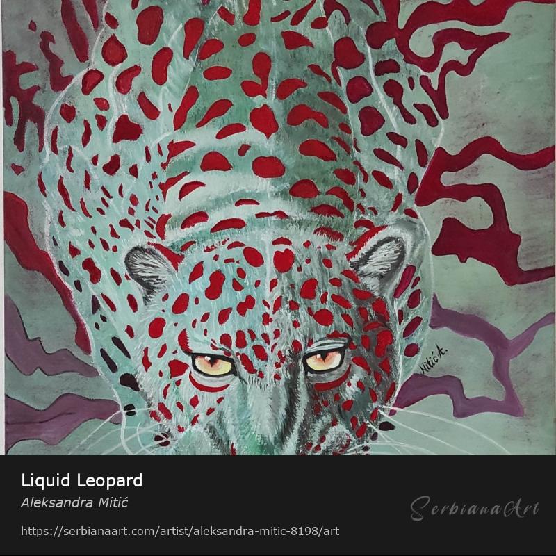 The painting "Liquid Leopard" depicts a leopard’s head in a surreal, almost liquid flow of colors. The red patterns and green shades create a strong contrast and convey a sense of energy in motion. The painting symbolizes strength, instinct, and the fluidity of life, expressed in a modern, abstract-naïve style.