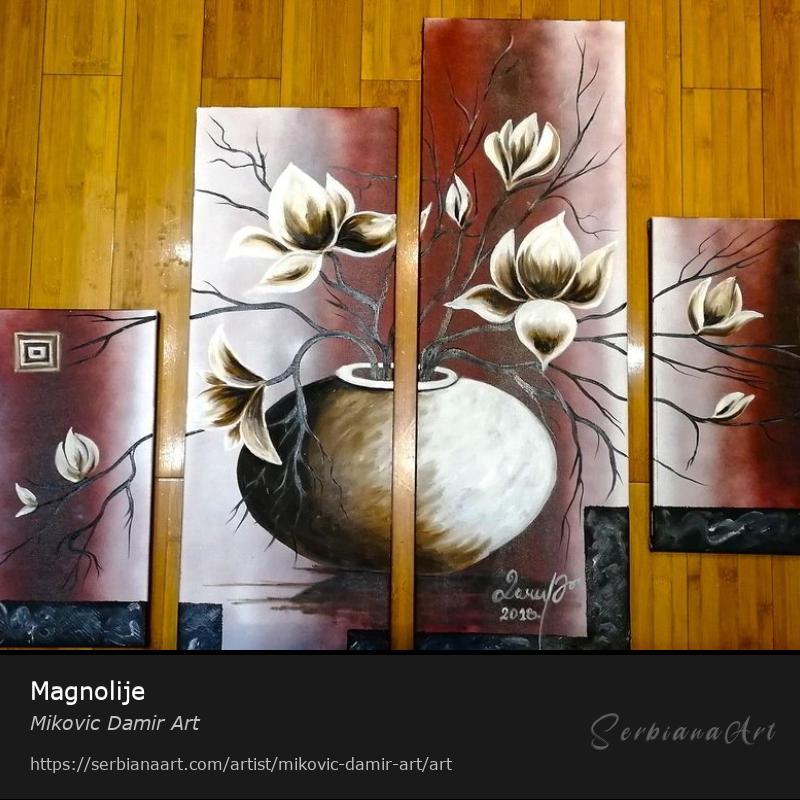 Magnolia 4 canvases. The whole picture in the set is 140 x 105 There are individually 2 canvases 40x40 and 2 canvases 70x25 Oil on canvasShare and promote this artwork